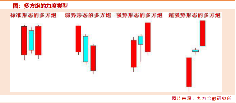 多方炮K线组合,按照三根K线组合形态的不同,又可以分为弱势多方炮,强势多方炮和超强势多方炮三种形态。