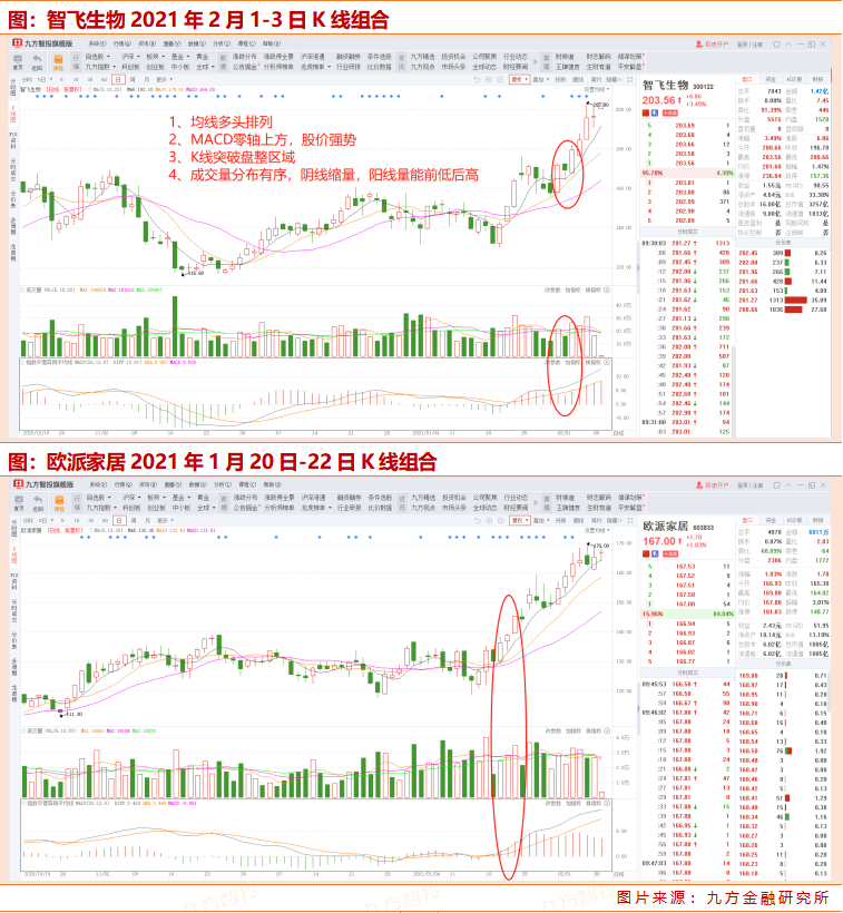 智飞生物2021年2月1-3日K线组合;欧派家居2021年1月20日-22日K线组合。