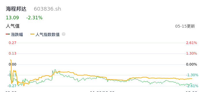 05月15日,海程邦达收报13.09,股价涨幅-2.31%,成交金额4604.05万元,换手率4.09%。