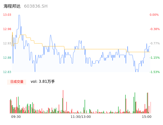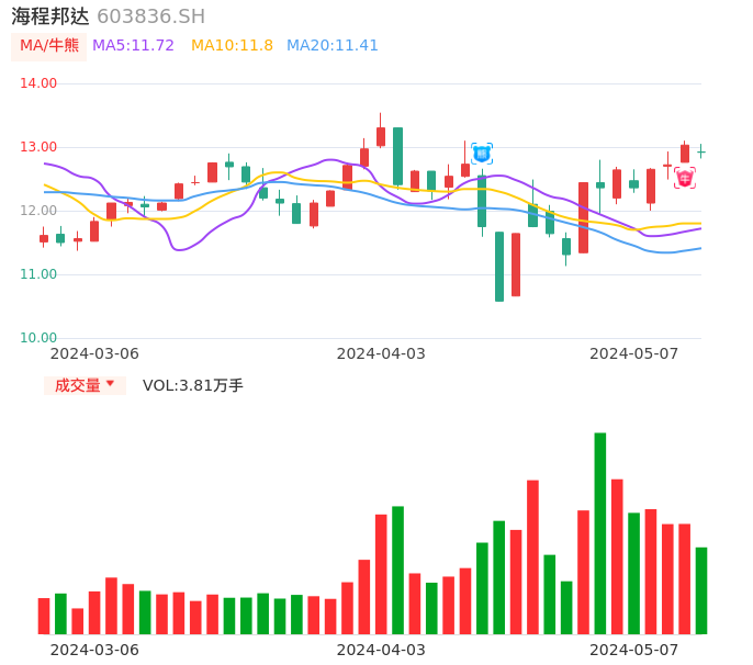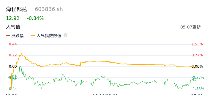 05月07日,海程邦达收报12.92,股价涨幅-0.84%,成交金额4911.79万元,换手率4.44%。