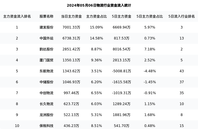 从主力资金流向来看,物流行业今日主力资金流入19.35亿元,在所有申万二级行业中排名:119/131。