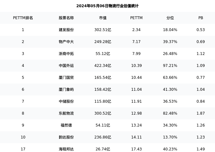 海程邦达最新报告期数据为一季度,下表汇总了物流行业内市值靠前的公司一季度主要经营数据