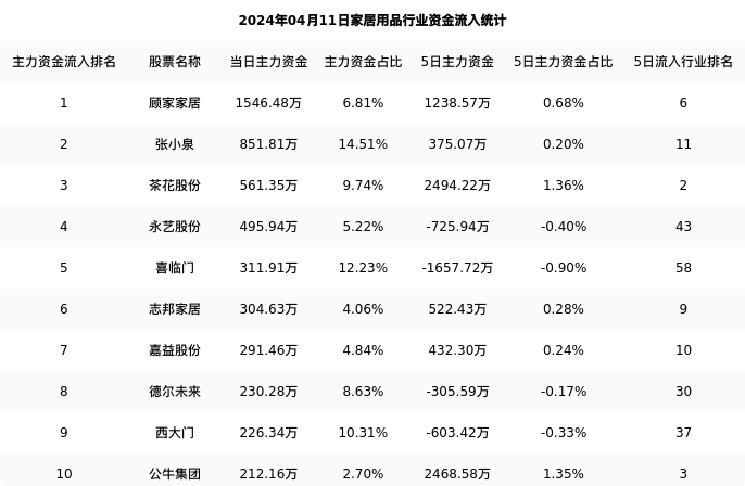 从主力资金流向来看,家居用品行业今日主力资金流入5.00亿元,在所有申万二级行业中排名:59/131。