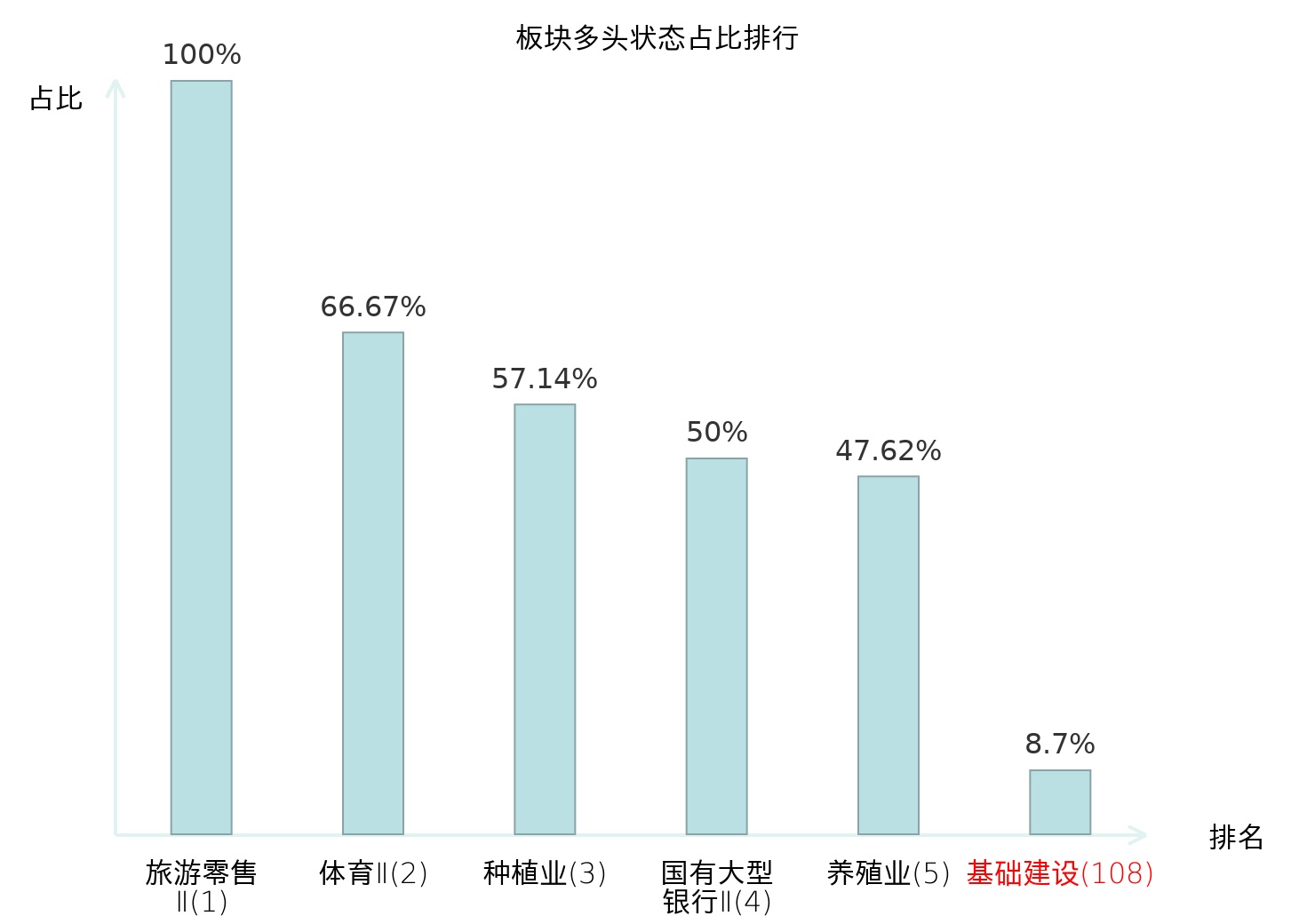 全市场所有行业板块中主力多头状态占比排名中,旅游零售Ⅱ板块位居第一。互联网电商板块名次提升最快,较昨日上升89位。
