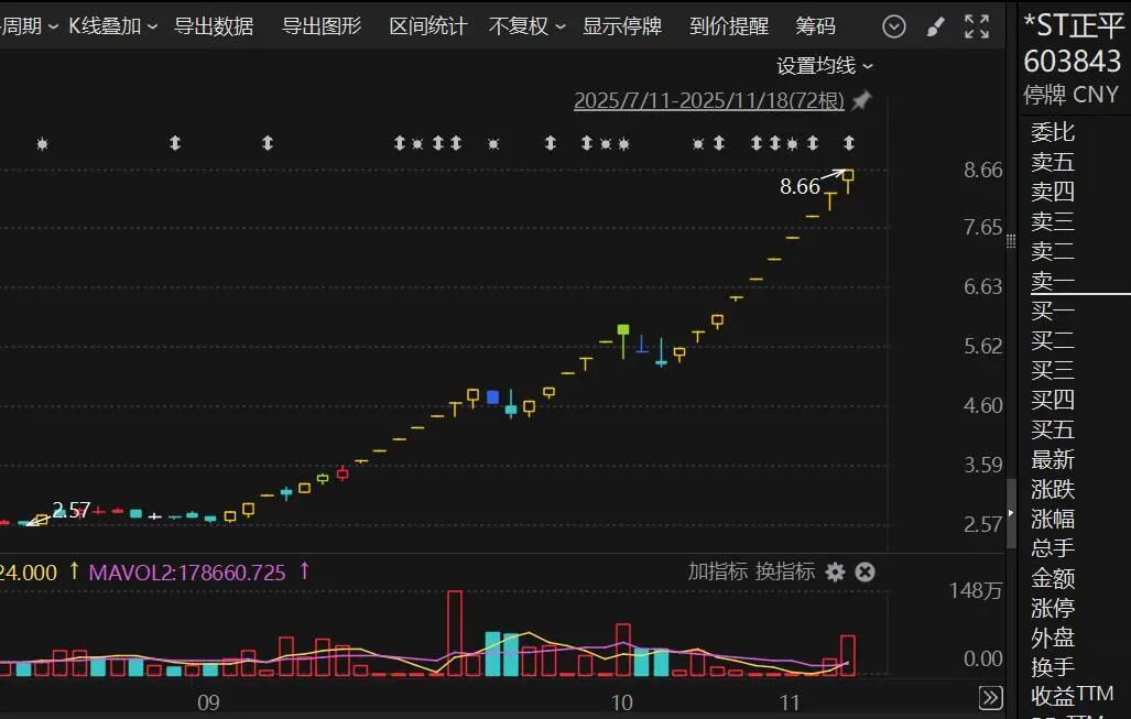 从2025年9月1日至11月18日,*ST正平股票累计涨幅达221.93%,股票短期涨幅与同期上证指数、建筑行业存在严重偏离。股价上涨过快,积累了较高的交易风险。为维护投资者利益,公司就股票交易情况进行停牌核查,于11月19日开市起停牌。
