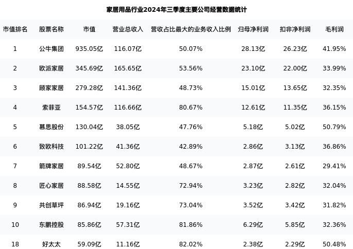 好太太最新报告期数据为三季度,下表汇总了家居用品行业内市值靠前的公司三季度主要经营数据