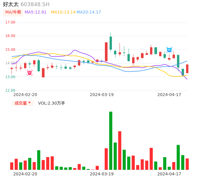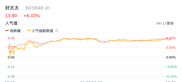 04月17日,好太太收报13.90,股价涨幅6.03%,成交金额3154.31万元,换手率0.57%。