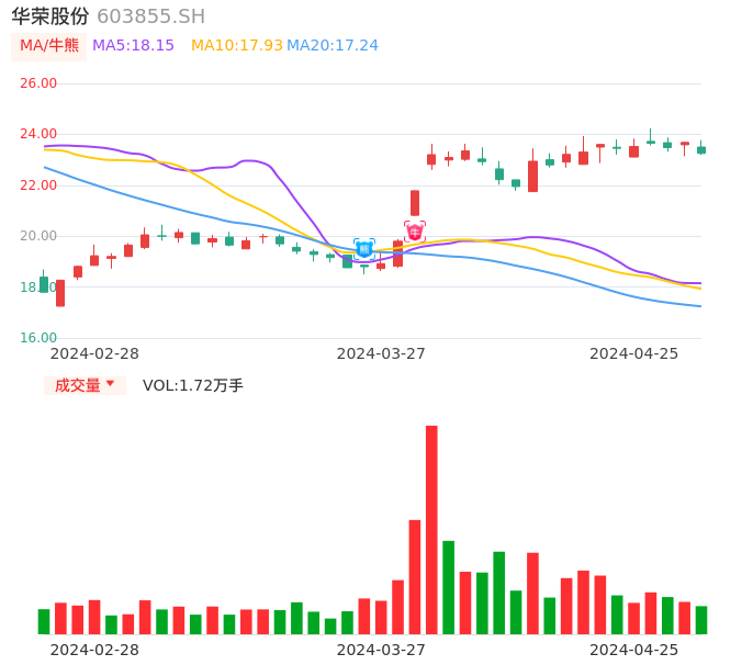 04月25日,华荣股份收报23.25,股价涨幅-1.82%,成交金额4028.18万元,换手率0.52%。