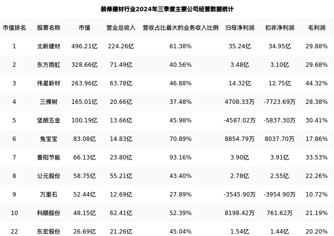东宏股份最新报告期数据为三季度,下表汇总了装修建材行业内市值靠前的公司三季度主要经营数据