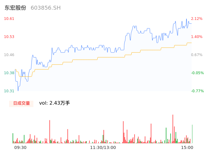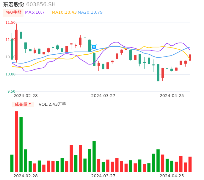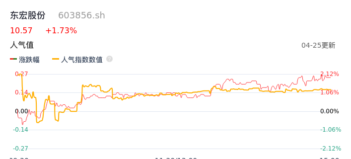 04月25日,东宏股份收报10.57,股价涨幅1.73%,成交金额2549.72万元,换手率0.95%。