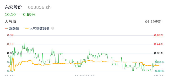 04月19日,东宏股份收报10.10,股价涨幅-0.69%,成交金额1806.89万元,换手率0.70%。