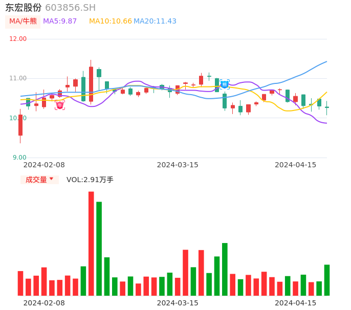 04月15日,东宏股份收报10.26,股价涨幅-0.39%,成交金额2987.49万元,换手率1.14%。