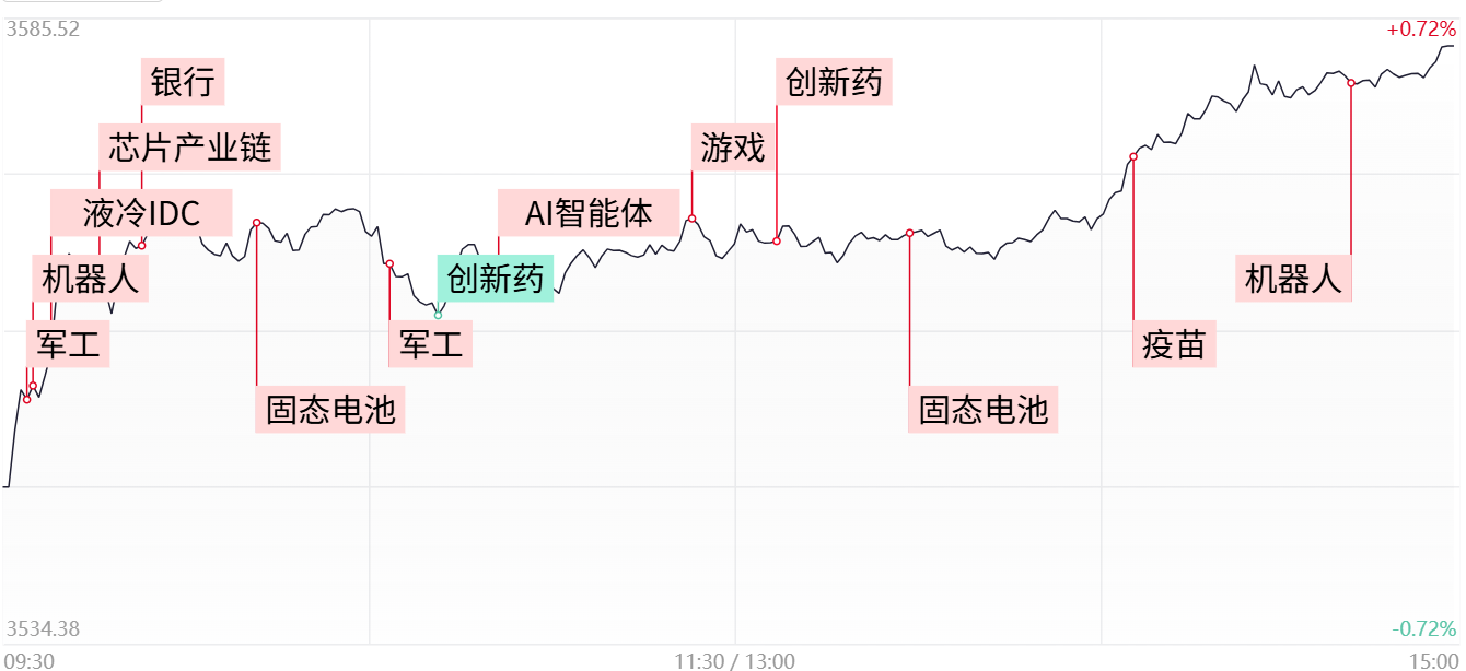 今日市场低开高走,最终三大指数全线收涨,超3800只个股飘红。但需注意的是,今日市场的量能进一步萎缩,并且指数仍处于5日线之下。明日走势较为关键,指数想要重新转强的话,需进一步带量反弹,且重新站稳于5日均线之上,届时沪指方有望再度挑战3640一线的压力区间。反之若遇5日线再度缩量回落,那么短线仍先以震荡整理结构看待。而从盘面上来看,目前延续良性轮动态势,一方面,军工、固态电池等前期调整过程的热点方向,受消息面的催化后再度走强,另一方面,创新药、AI应用等近期热门板块虽一度走低,但在盘中依旧能够获得资金强而有力的承接,可见市场整体维持着较高活跃度,因此只要相关热门板块中期趋势没有遭到破坏,仍可短线分歧整理的过程中寻找一些核心个股的低吸机会。