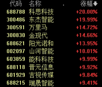 8月4日,人工智能板块盘中震荡拉升,截至发稿,科思科技、东杰智能20%涨停,山河智能、能科科技等涨停,万里马、阳光诺和等涨超10%。
