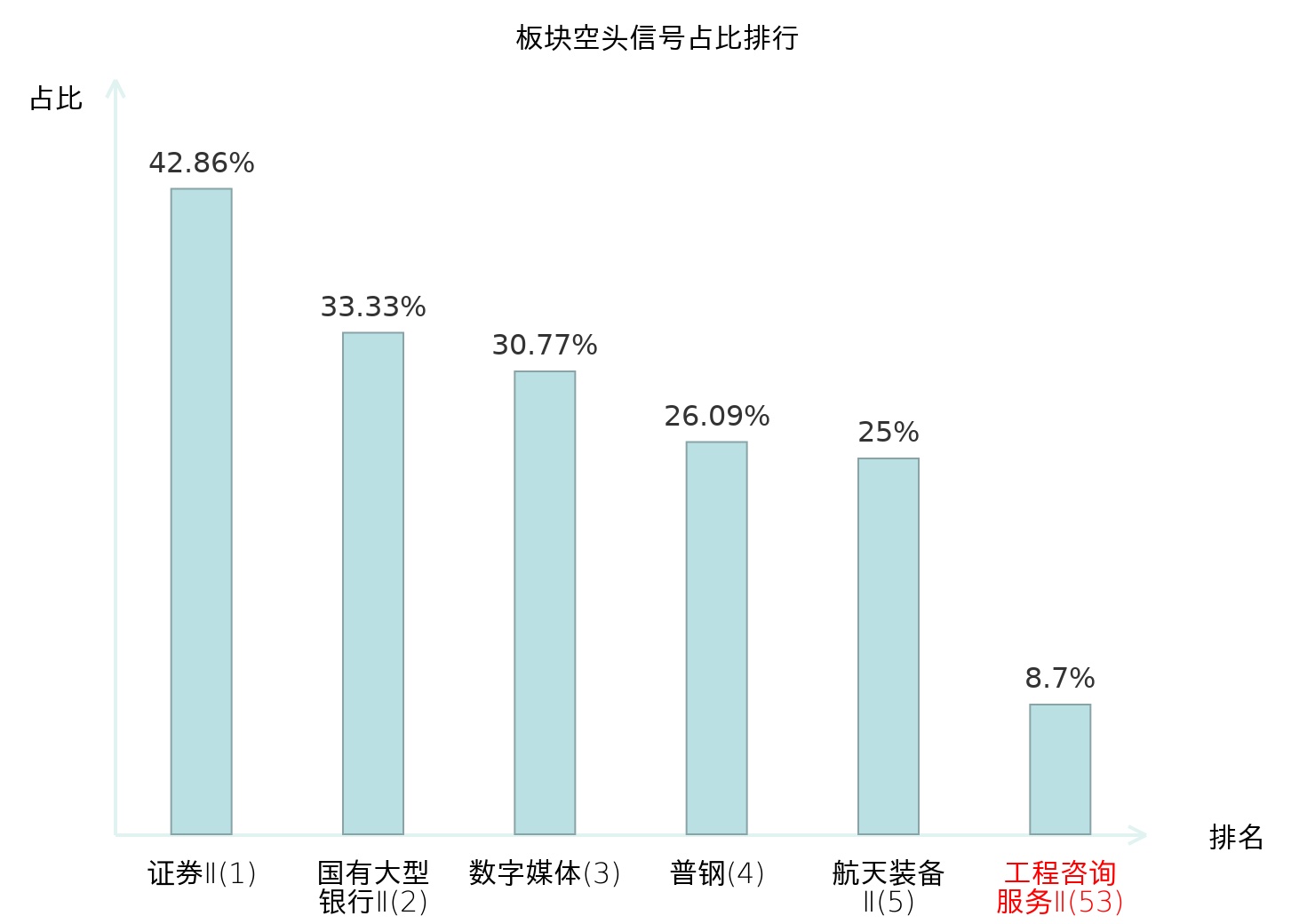 全市场所有行业板块中主力空头信号占比排名中,证券Ⅱ板块位居第一。证券Ⅱ板块名次提升最快,较昨日上升127位。