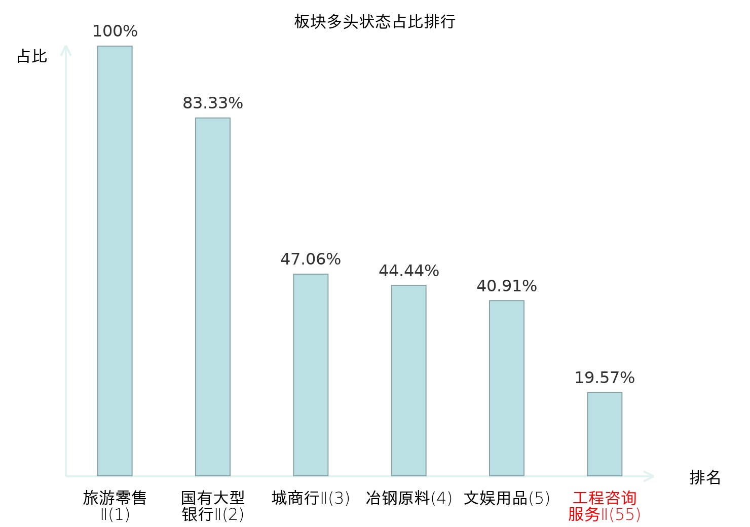 全市场所有行业板块中主力多头状态占比排名中,旅游零售Ⅱ板块位居第一。旅游零售Ⅱ板块名次提升最快,较昨日上升130位。