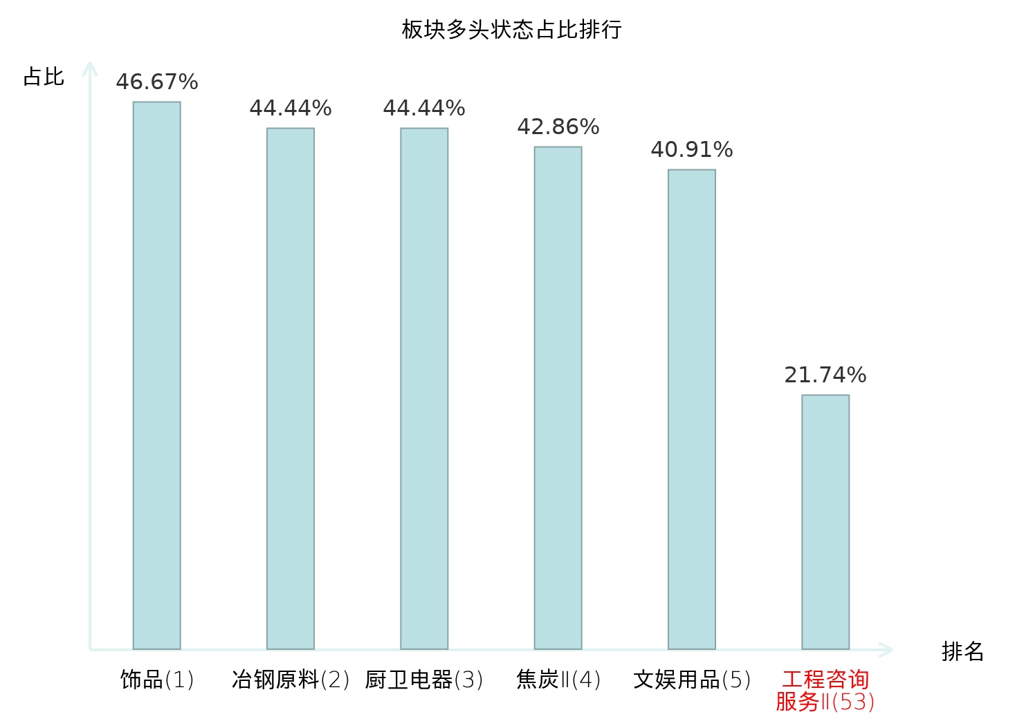 全市场所有行业板块中主力多头状态占比排名中,饰品板块位居第一。专业连锁Ⅱ板块名次提升最快,较昨日上升68位。