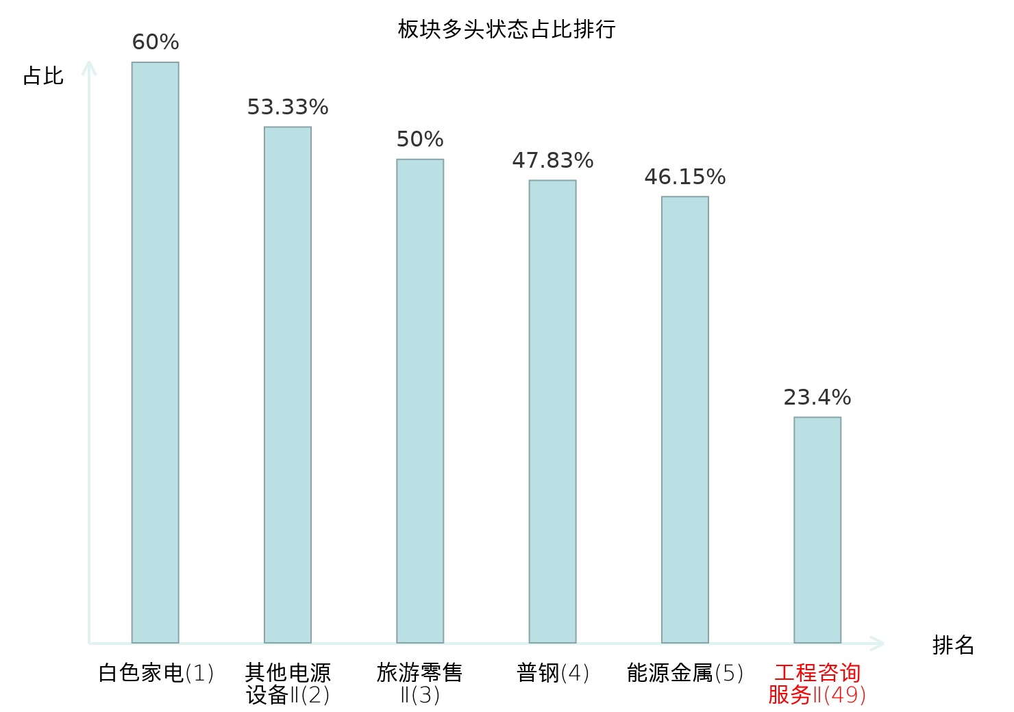 全市场所有行业板块中主力多头状态占比排名中,白色家电板块位居第一。照明设备Ⅱ板块名次提升最快,较昨日上升55位。
