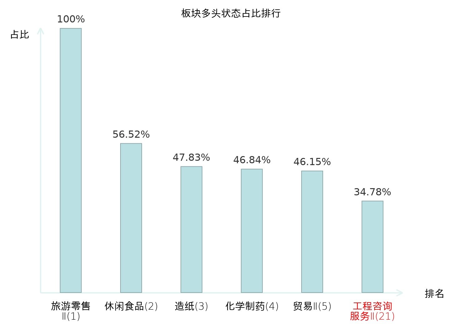 全市场所有行业板块中主力多头状态占比排名中,旅游零售Ⅱ板块位居第一。动物保健Ⅱ板块名次提升最快,较昨日上升58位。