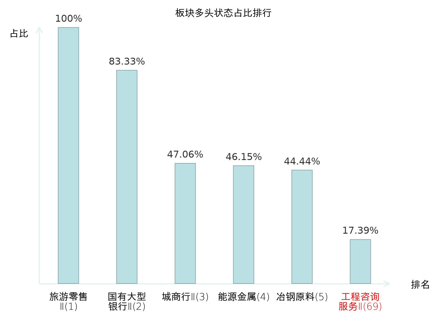 全市场所有行业板块中主力多头状态占比排名中,旅游零售Ⅱ板块位居第一。照明设备Ⅱ板块名次提升最快,较昨日上升59位。