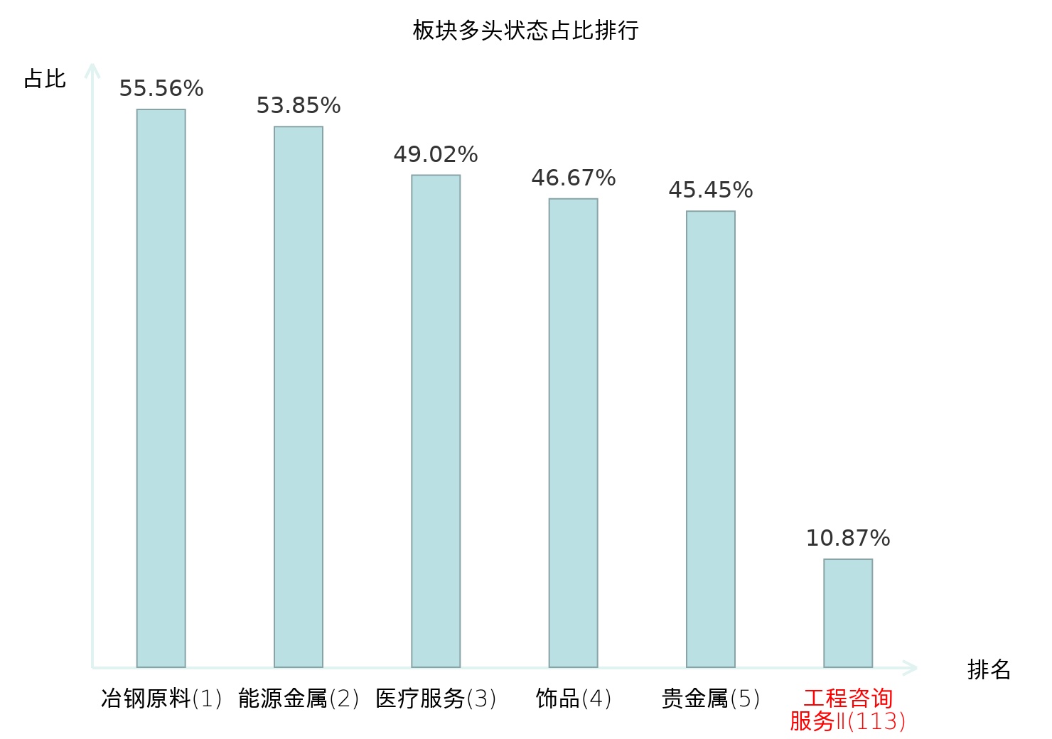 全市场所有行业板块中主力多头状态占比排名中,冶钢原料板块位居第一。能源金属板块名次提升最快,较昨日上升89位。