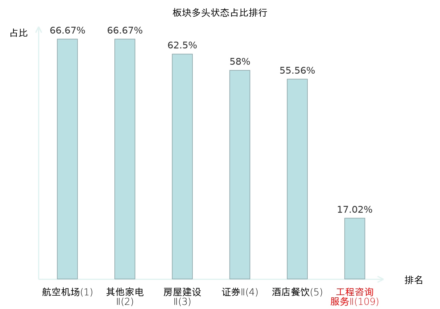 全市场所有行业板块中主力多头状态占比排名中,航空机场板块位居第一。装修建材板块名次提升最快,较昨日上升62位。