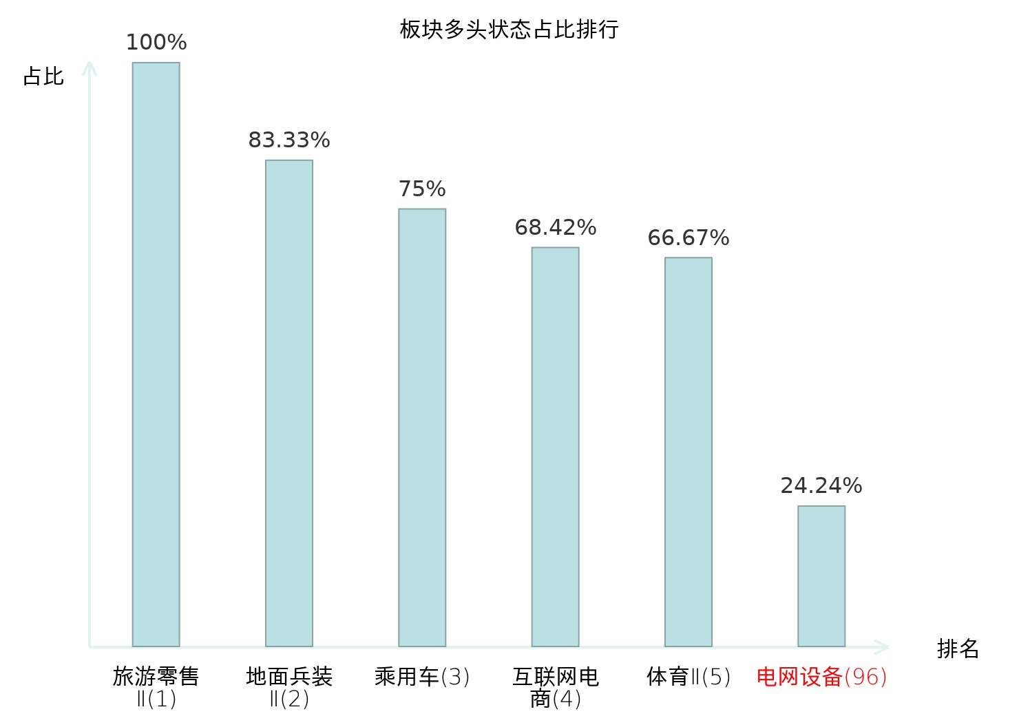 全市场所有行业板块中主力多头状态占比排名中,旅游零售Ⅱ板块位居第一。房屋建设Ⅱ板块名次提升最快,较昨日上升50位。