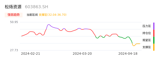 我们来看一下该股的九方特色指标强弱趋势的情况:松炀资源近日从观望区进入支撑区。股价出现一波快速下跌行情,目前下跌动能仍未衰竭。建议继续谨慎观望。注意今日下方支撑位:32.04元,如有效跌破将可能出现新一轮下跌