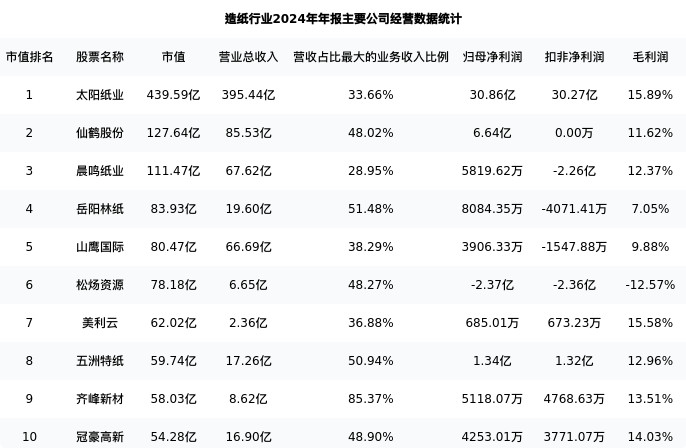 松炀资源最新报告期数据为年报,下表汇总了造纸行业内市值靠前的公司年报主要经营数据