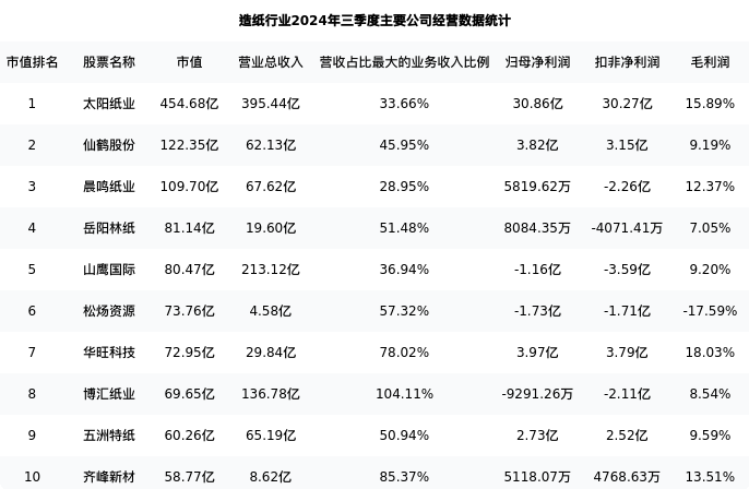 松炀资源最新报告期数据为三季度,下表汇总了造纸行业内市值靠前的公司三季度主要经营数据