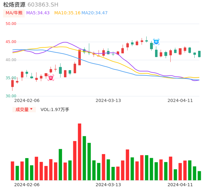 04月11日,松炀资源收报40.80,股价涨幅-1.59%,成交金额8130.27万元,换手率0.96%。