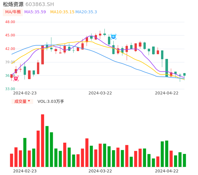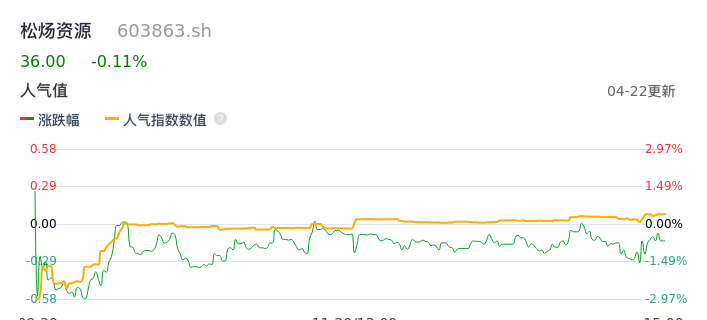 04月22日,松炀资源收报36.00,股价涨幅-0.11%,成交金额1.08亿元,换手率1.48%。