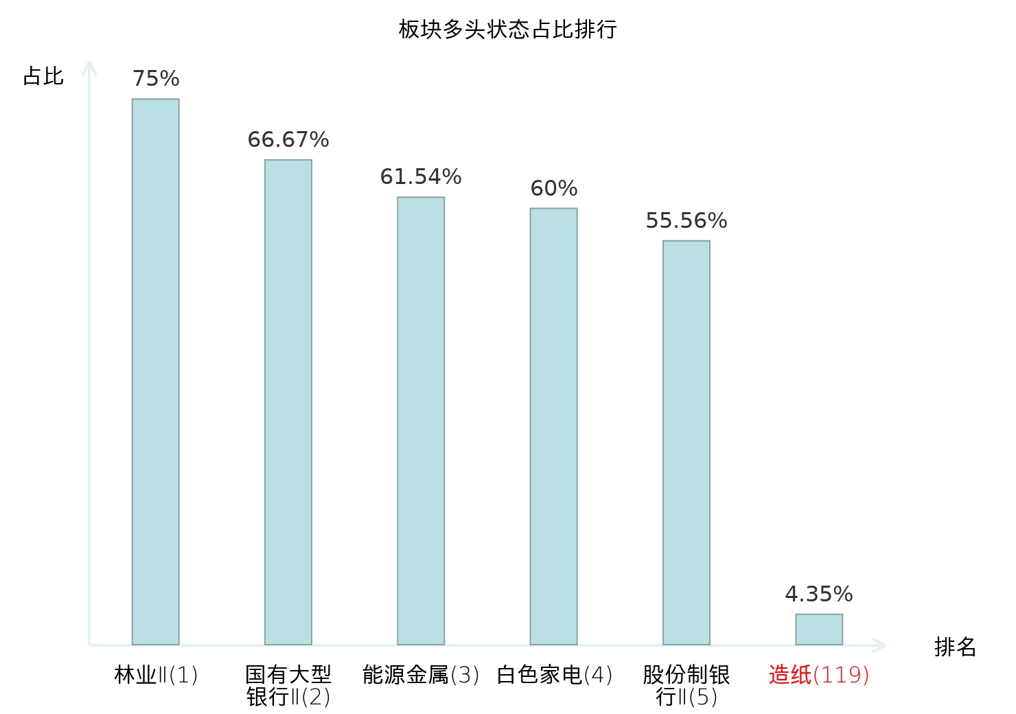 全市场所有行业板块中主力多头状态占比排名中,林业Ⅱ板块位居第一。数字媒体板块名次提升最快,较昨日上升48位。