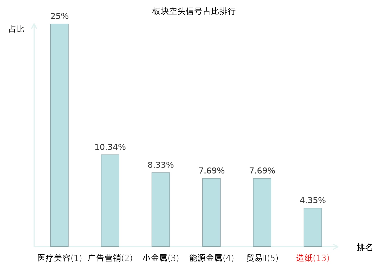 全市场所有行业板块中主力空头信号占比排名中,医疗美容板块位居第一。广告营销板块名次提升最快,较昨日上升113位。