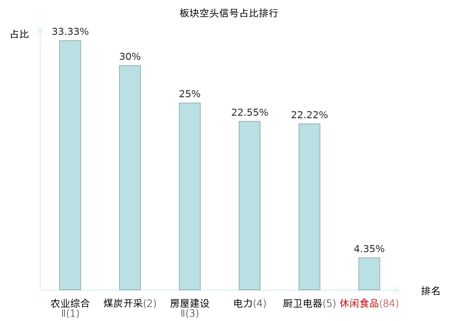 全市场所有行业板块中主力空头信号占比排名中,农业综合Ⅱ板块位居第一。旅游及景区板块名次提升最快,较昨日上升112位。