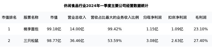 桃李面包最新报告期数据为一季度,下表汇总了休闲食品行业内市值靠前的公司一季度主要经营数据