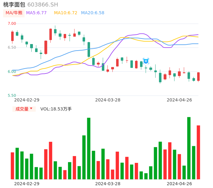 04月26日,桃李面包收报5.98,股价涨幅2.93%,成交金额1.09亿元,换手率1.16%。