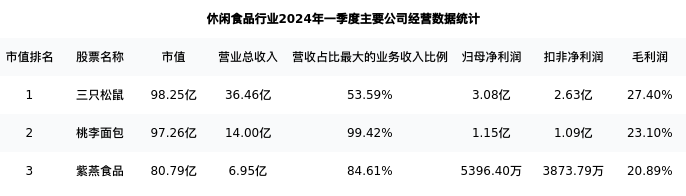桃李面包最新报告期数据为一季度,下表汇总了休闲食品行业内市值靠前的公司一季度主要经营数据