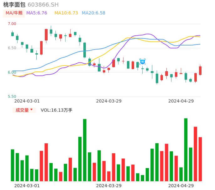 04月29日,桃李面包收报6.12,股价涨幅2.34%,成交金额9826.87万元,换手率1.01%。