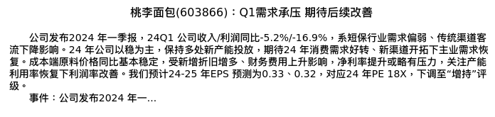 值得注意的是:2024年04月招商证券的于佳琦/胡思蓓分析师,首次发布关于桃李面包的研究报告,标题为:桃李面包(603866):Q1需求承压 期待后续改善。
