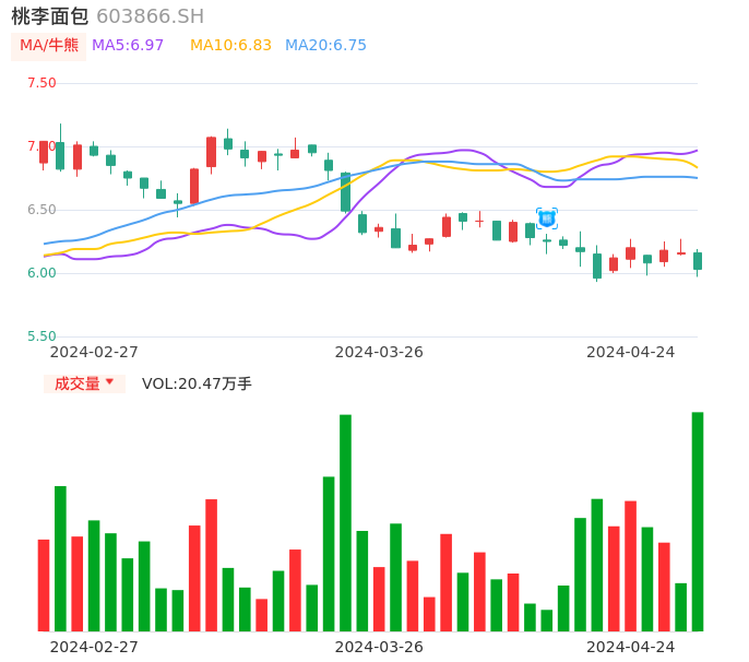 04月24日,桃李面包收报6.03,股价涨幅-2.11%,成交金额1.23亿元,换手率1.28%。