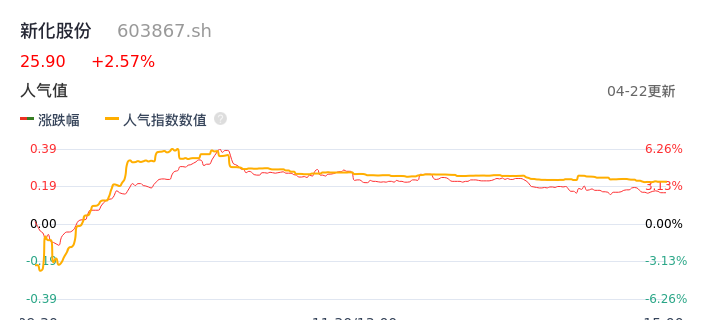 04月22日,新化股份收报25.90,股价涨幅2.57%,成交金额5255.16万元,换手率1.09%。