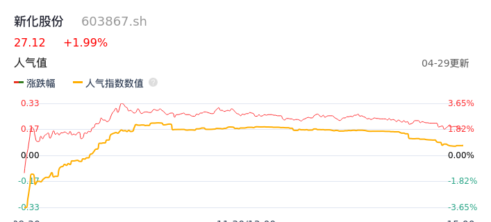 04月29日,新化股份收报27.12,股价涨幅1.99%,成交金额6868.83万元,换手率1.37%。