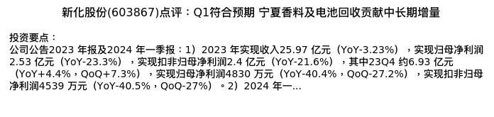值得注意的是:2024年04月上海申银万国证券研究所的分析师,首次发布关于新化股份的研究报告,标题为:新化股份(603867)点评:Q1符合预期 宁夏香料及电池回收贡献中长期增量。