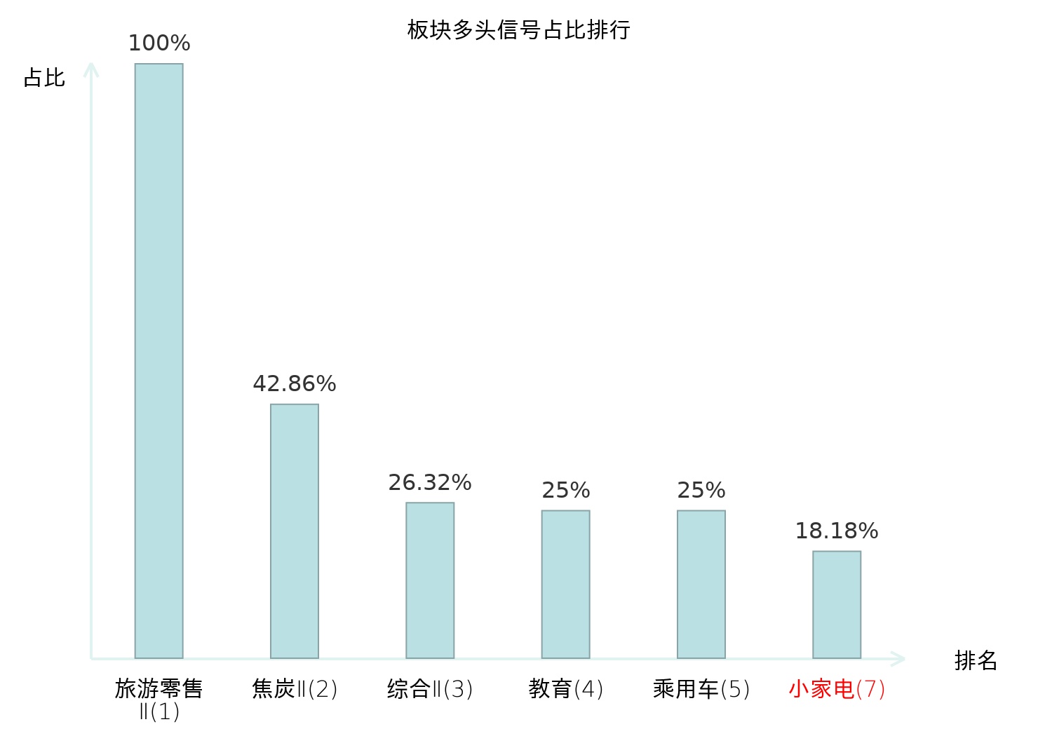 全市场所有行业板块中主力多头信号占比排名中,旅游零售Ⅱ板块位居第一。旅游零售Ⅱ板块名次提升最快,较昨日上升130位。