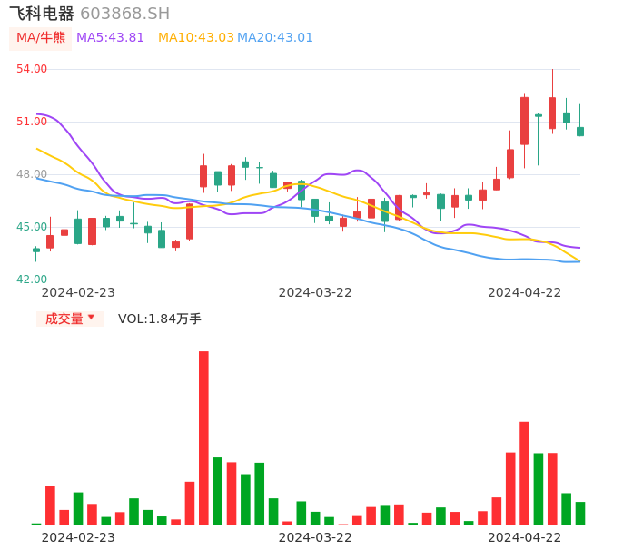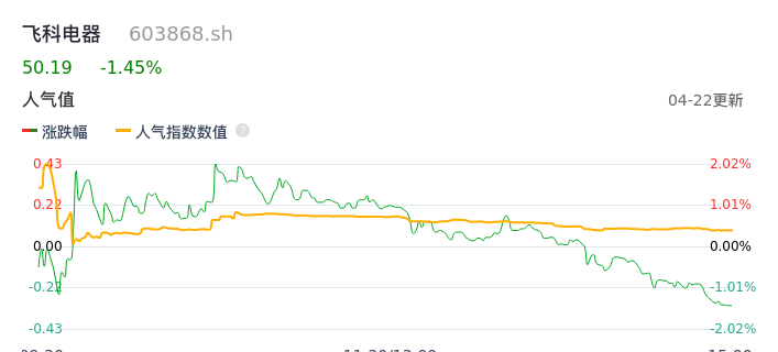 04月22日,飞科电器收报50.19,股价涨幅-1.45%,成交金额9396.39万元,换手率0.42%。