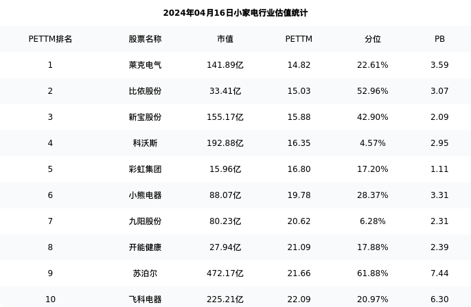 从估值角度看:飞科电器最新市盈率PETTM为22.09,在行业内排名10/20,处于20.97分位。