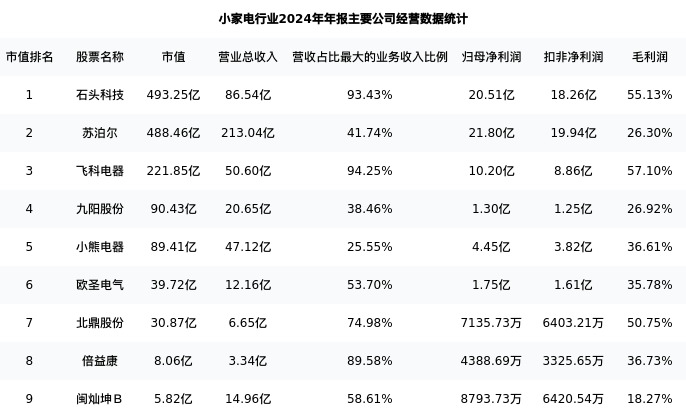 飞科电器最新报告期数据为年报,下表汇总了小家电行业内市值靠前的公司年报主要经营数据