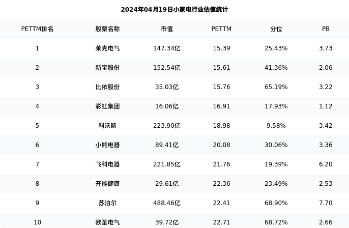 从估值角度看:飞科电器最新市盈率PETTM为21.76,在行业内排名7/20,处于19.39分位。