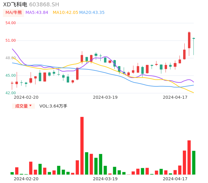 04月17日,XD飞科电收报51.30,股价涨幅-2.06%,成交金额1.84亿元,换手率0.84%。